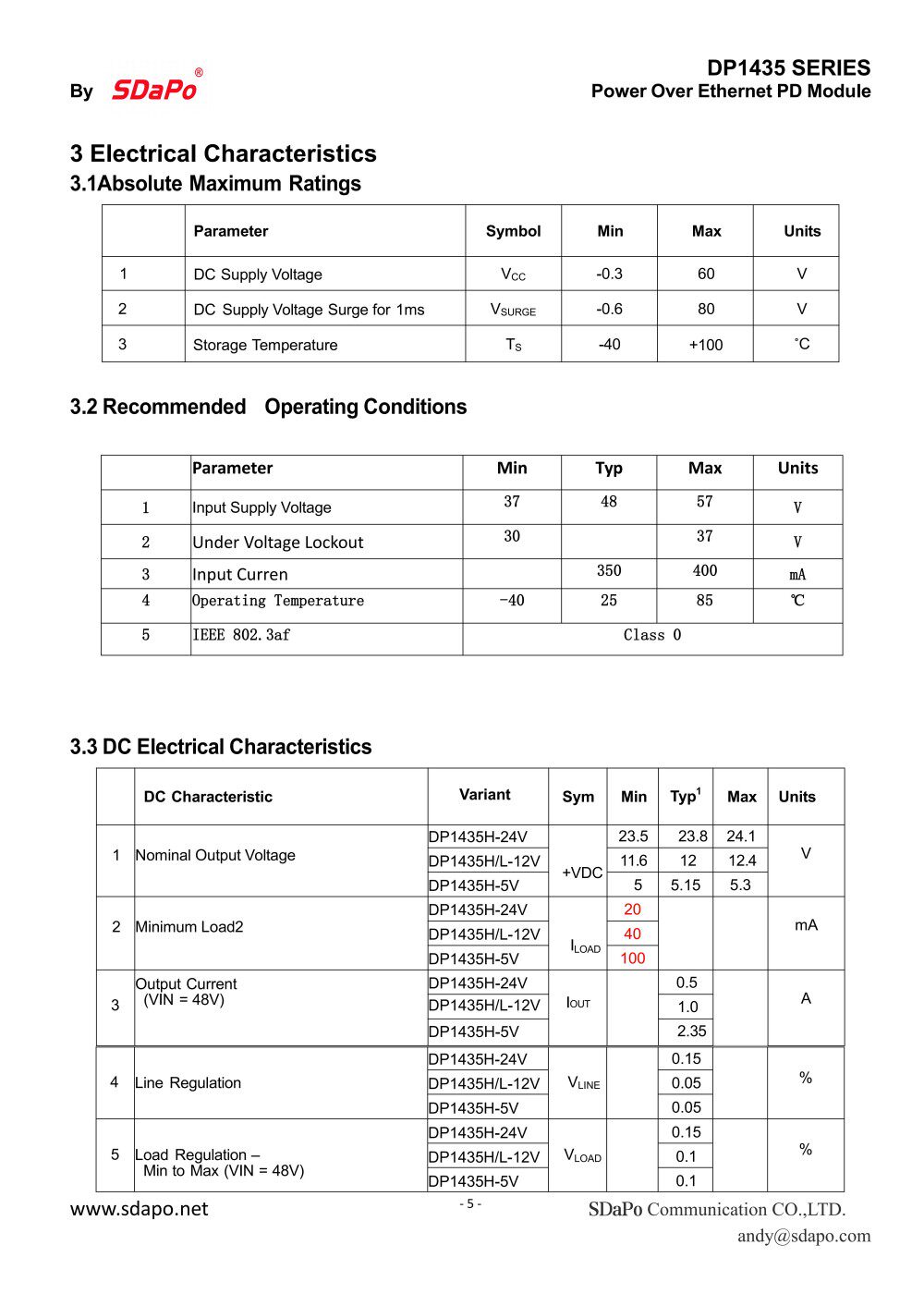 ELECTRICAL SPECIFICATIONS